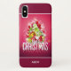coque Casemate avec vos initiales ou votre nom personnalisés. Conçu avec un design graphique de Noël lumineux et festif. Le texte dit Joyeux Noël & Bonne Année. Conçu avec un monticule de cadeaux en forme d'arbre avec des flocons de neige festifs, des étoiles, des baubles de noël et des étincelles à l'air brillant. Aiguilles de pin et illustration en forme d'arbre également inclus dans cette image de vacances. L'arrière - plan est une couleur rose rougeâtre vibrante.