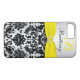 Ce damas moderne, personnalisé, noir et gris argenté Barely There™ iPhone 7 coque avec un ruban IMPRIMÉ jaune et broche de bijoux IMPRIMÉE, a un emplacement pour vous d'ajouter votre nom et monogramme. ***VEUILLEZ vous assurer que votre initiale et votre nom sont centrés là où vous le voulez, comme il apparaîtra sur votre écran. Si vous avez besoin d'aide pour personnaliser ce coque, envoyez un courriel à niteowlstudio@gmail.com.