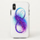 Infinity symbole with a beautiful feather painted in purple and blue bright colors on white background