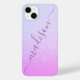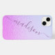 Iridescente Girly Pink Shimmer Nom personnalisé iPhone 14 Plus Smart Phone Case dispose d'un motif moderne rose et bleu iridescente shimmer avec votre nom personnalisé en violet écriture calligraphie script typographie. Conçu par ©Evco Studio www.zazzle.com/store/evcostudio