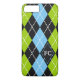 Jacquard motif noir, vert, bleu monogramme personnalisé féminin iPhone 7 plus coque. Formes de diamant en noir, vert citron et bleu ciel, lignes diagonales croisées blanches et un diamant avec vos initiales.