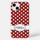 Personnalisez le coque iphone à la mode rétro avec votre initiale et votre nom. Motif rétro Cool adorable avec points blancs et arrière - plan rouge foncé.