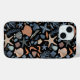 Un étui de téléphone d'été couleur aquarelle brun avec un motif de coquillages, de corail et d'étoiles de mer, dans les tons bleus et oranges gras sur un arrière - plan noir.