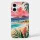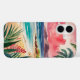 Un littoral tropical paisible où sable doré côtoie vagues turquoise et ondulantes. Des palmiers luxuriants se dressent sous un coucher de soleil rose et turquoise. L'évasion idéale pour ceux qui aiment la plage et la brise marine.