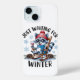 A charming raccoon sits comfortably in a rocking chair, wearing a cozy red hat and a blue scarf, holding a glass of wine. Snowflakes gently fall around, creating a winter wonderland atmosphere. The scene transitions with a smooth zoom-in on the raccoon, highlighting its cheerful expression. The background features pinecones and a soft, snowy landscape, enhancing the cozy vibe. The text 'JUST WAITING FOR WINTER' arches above in a playful font, complementing the whimsical style.