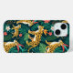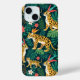 Des léopards portant des coiffes en plumes, entourés de fleurs tropicales et de feuilles dans un cadre dense dans la jungle, des couleurs vives, un design ludique.