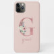 Chic et girly initial G, coque iphone monogramme pour 11 Pro Max et beaucoup d'autres modèles. Le design à la lettre fleurie comprend une lettre G rose parties scintillant agrémentée d'un joli bouquet d'aquarelle de corail rose et de fleurs d'ivoire au feuillage. Votre nom est écrit en caractères de caractères manuscrits roses et le modèle de nom est configuré pour vous permettre de personnaliser. La conception a une couleur arrière - plan douce rose pâle (pour éditer, cliquez sur "personnaliser" et entrez l'outil de conception). Parcourez notre magasin pour trouver d'autres initiales.