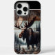 Un orignal majestueux aux gros bois se dresse dans une forêt enneigée, sa forme sombre contraste avec le paysage blanc.