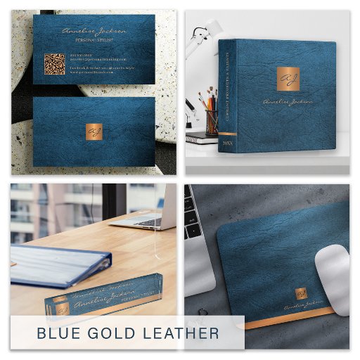 Monogrammed blue leather and gold office setConçu par Anka Designs
