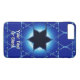 Une simple image fractale aux tons bleus représentant plusieurs instances d'un David magen (Étoile de David) formé par des lignes croisées en verre ou en cristal, l'étoile centrale est remplie de bleu foncé. Ajoutez votre propre texte.