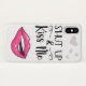 Ce boîtier téléphonique branché kiss me présente un dessin d'une paire de lèvres de dessin animé magenta et la légende Shut up & Kiss Me dans une police moderne noire sur un arrière - plan blanc aux coeurs gris.