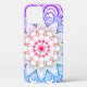 Un étui téléphonique blanc au design mandala qui passe du violet au bleu en bas, avec un motif central fleuri en rouge, orange et blanc.