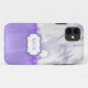 Coque iphone chic fait dans un look marbré blanc et violet, en haut et en bas du coque, un look de feuille violet. Une zone de texte encadrée en violet, blanche et violette, a du texte mauve prêt à être personnalisé, pour répondre à vos besoins.