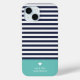 Élégant étui téléphonique personnalisé en aqua, bleu marine et blanc. Ce design est composé d'un classique de la marine et d'un motif rayé blanc. Personnalisez-le avec votre nom monogramme ou tout autre texte personnalisé avec un symbole de coeur mignon. Utilisez les outils de conception pour choisir les couleurs arrière - plans, modifier les polices de texte et les couleurs et télécharger vos propres photos pour créer une couverture unique d'un appareil unique!