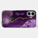 Purple Gold Floral Agate Monogram iPhone 16 Plus Coque. Protégez votre iPhone avec style grâce à cette couverture chic et sophistiquée avec un design époustouflant d'agate violet et or et nom de monogramme de script personnalisé. Inspiré par la beauté fascinante des pierres et des géodes naturels, ce coque présente des motifs tourbillonnants en marbre de violet profond accentués de veines dorées éclatantes. Les élégants roses floraux violets et dorés apportent une touche romantique, mêlant parfaitement opulence et charme de la nature. Ce boîtier de téléphone agate offre une protection fiable tout en élevant l'esthétique de votre téléphone. Idéal pour ceux qui aiment le charme intemporel des pierres précieuses et des designs luxueux, cette couverture iPhone est à la fois fonctionnelle et à la mode avant, en faisant un cadeau parfait ou un accessoire personnel.