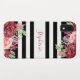 Cette couverture téléphonique est composée de rayures noires et blanches avec aquarelle bordeaux et roses de pêche et fleurs avec feuillage. Personnalisez-le avec un nom.