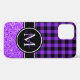 Design monogrammé personnalisable noir, blanc et bleu violet. En haut se trouve un en vichy de bûcheron noir personnalisable ou un motif de style plaid à buffle. En bas, une photo de parties scintillant violette. Le design est une photo, donc fausse texture de parties scintillant. Créez votre propre coque monogramme personnalisé. Essayez une police ou une couleur différente dans le système pour convenir à votre style personnel. Si vous voulez centrer le mandala monogramme, nous vous suggérons de sélectionner tous les éléments de conception et de les déplacer ensemble.