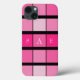 Coque iPhone 13. Carrés géométriques noirs et roses. Monogramme.