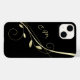 Voici un élégant boîtier téléphonique qui comporte une feuille d'or moderne tourbillonnant contre un arrière - plan noir dramatique. Votre monogramme à deux lettres est à gauche en or pâle assorti.