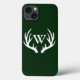 Silhouette de cerf blanc rustique avec une lettre monogramme personnalisée en blanc. L'arrière - plan est chasseur vert peut être customisé. Ce coque robuste fait un grand cadeau de chasseur de cerfs.