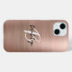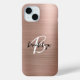 Cet élégant étui de téléphone personnalisé présente un monogramme et un prénom en écriture moderne noir et blanc sur un arrière - plan en métal brossé or rose tendance.