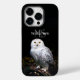 Portrait animal photo d'une majestueuse chouette enneigée debout sur une branche avec un nom personnalisé personnalisé monographie ci-dessus.