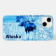 Image bleue et blanche d'un orignal de vache en milieu urbain en hiver. Lecture de texte personnalisable, "Alaska" apparaît également. Les orignaux sont des résidents de nombreuses collectivités de l'Alaska qui vivent toute l'année. Ici à Anchorage il y a environ 1500 animaux, ainsi que des loups, des ours bruns et d'autres animaux sauvages.Ils sont généralement bien élevés. Ils traversent souvent les rues aux passages piétons après avoir attendu un signal de marche. D'une photo d'une orignale qui a traversé ma cour.