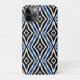 Un motif abstrait bleu, blanc et noir, caractérisé par des formes dynamiques et diamant qui se chevauchent et se chevauchent, créant une composition visuellement frappante et moderne.