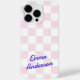 Couverture téléphonique avec votre nom en bleu une police de style rétro sur un motif en damier rose pâle et blanc.