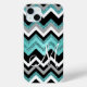Motif à bandes zig zig zag de chevron de parties scintillant turquoise, blanc, noir et faux brillant. Avec de la place pour customiser ou personnaliser avec un monogramme ou une initiale de votre choix. Belle couverture moderne et cool pour le brancheur tendance et amateur d'art branché, amoureux de motifs artistiques qui veut protéger leur téléphone de la poussière et de la saleté, de l'usure et de la déchirure. Cette conception est disponible dans les coques de téléphones cellulaires Apple iPhone 6, 7 et 8 Plus, 10 ou X, XR, XS, 11, 12 et 13 Mini, 14, 15 Plus et Pro Max. Montrez votre style, regardez à la mode, et sentez élégant avec un design unique sur un accessoire mobile de votre choix.