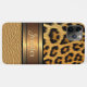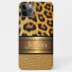 De beaux taches de fourrure de léopard contemporain motif et faux cuir doré brillant. Avec une fausse bannière métallique couleur or et cuivre à travers pour personnaliser ou customiser avec un nom, monogramme ou initiales de votre choix. Belle couverture moderne et cool pour le brancheur tendance et amateur d'art branché, amoureux de motifs artistiques qui veut protéger leur téléphone de la poussière et de la saleté, de l'usure et de la déchirure. Cette conception est disponible en Apple iPhone 6, 7, 8, 10 ou X, XR, XS, 11, 12, 13 Mini, 14, 15 Plus, et coques de téléphones portables Pro Max. Montrez votre style, regardez à la mode, et sentez élégant avec un design unique sur un accessoire mobile de votre choix.