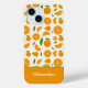Un étui téléphonique avec une tranche, la moitié et le motif orange plein. Un prénom ou un texte personnalisable de votre choix est disponible en bas. Un cadeau frais pour un ami qui aime les agrumes.