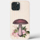 Joli étui de téléphone à look vintage avec champignons rose teinté avec fleurs roses et feuilles vert luxuriant sur un arrière - plan rayé vintage
