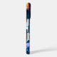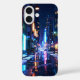 Élégant étui de téléphone animé montrant une rue enneigée de la ville la nuit avec des néons brillants et des flocons de neige en chute. Parfait pour les ambiances urbaines et cyberpunk.