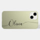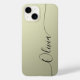 Beige Shimmer Black Elegant Calligraphie Script Personnalisé Nom iPhone 14 Smart Phone Boîtes dispose d'un design moderne et tendance simple et élégant avec votre nom personnalisé dans élégante écriture calligraphie script typographie sur un arrière - plan métallique beige shimmer. Conçu par ©Evco Studio www.zazzle.com/store/evcostudio