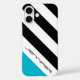 Ce coque personnalisé moderne, moderne, noir et blanc pour l'iPhone est une excellente protection et décoration pour votre nouveau téléphone portable. Le design de bandes diagonales funky est chic, élégant et attrayant! Touch of aqua blue ajoute de l'excitation. Facile à personnaliser le nom. Tous droits réservés © 2024 Alan & Marcia Socolik.