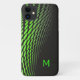 Coque iphone moderne fait en noir avec un motif de point en cascade vert néon et un monogramme d'une seule lettre. Personnalisez l'initiale pour vous-même ou comme une excellente idée cadeau.