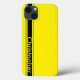 Un coque iphone jaune avec une course noire rayé sur le côté gauche. Customisez ce coque iphone avec votre nom et en changeant les couleurs, il n'y a aucune limite.