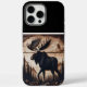 Une sculpture détaillée sur bois d'un orignal debout dans un cadre forestier, avec des montagnes en arrière - plan. La sculpture est encadrée d'une bordure rustique en bois.