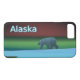 Un ours polaire arpente la glace pendant la longue nuit polaire; les aurores boréales en rouge et vert au loin. La lecture de texte " ; Alaska" ; en bleu et blanc brillant apparaît également.