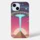 A stunning sci-fi artwork showing a colossal UFO hovering above a glowing pyramid as a blue energy beam shines through the sunset sky. The mix of purples, blues, and oranges gives a surreal cosmic vibe, blending ancient mystery with futuristic energy.