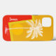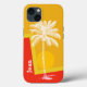 Coque iphone élégant, avec des graphiques d'un palmier sur un arrière - plan abstrait de lever de soleil orange et jaune. Personnalisez le texte personnalisé pour vous-même ou comme une excellente idée cadeau.