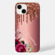 Faux parties scintillant de bronze goutte à goutte, la peinture goutte à goutte sur faux arrière - plan métallique de cuivre. Floraux, fleurs de couleur bordeaux et or rose. Personnalisez et ajoutez votre nom. Le nom en or rose est écrit avec un script de style à la main moderne et tendance.
