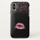 coque iphone branchée avec un arrière - plan noir, un confetti de parties scintillant rose, un rouge à lèvres rose verdoyant et votre nom.