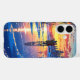 Boîtier téléphonique minimaliste inspiré de dessins animés représentant un lac gelé avec des patineurs sur glace entouré d'arbres enneigés et de reflets dorés au coucher du soleil. Idéal pour des motifs hivernaux pittoresques et festifs.