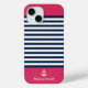 Personalize this cute Navy and White Striped Nautical Print Phone Case with your name on a red background. The design features a modern white script typography on a red background. The example is for an iPhone 15 model, but it will fit other models on Zazzle. Please verify before purchasing.