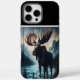 Un tableau encadré d'un orignal avec de grands bois, debout dans un lac boisé, avec des montagnes en arrière - plan.