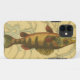 Cette copie illustre une image artistique d'un poisson de perche jaune. L'arrière - plan montre une carte géographique vintage dans des couleurs beiges légères. Le cadre brun ressemble au vieux motif en bois avec les fleurs jaune-rouges dans les bords. Une grande addition à votre collection de pêche !