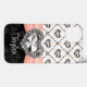 Personalize this beautiful pink and black damask FAUX PRINTED rhinestone heart and diamond look design with a pink satin bow and repeating solitaire diamond and heart patterned design. Your name can be added to the bottom of the case that is black with a subtle gray damask background. No three dimension embellishments have beadded. Image veut faire impression flat as shown in the product view. Artiwork and design © Chrissy H. Studios, LLC. La Réserve des Droits.