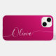 Pink Shimmer White Elegant Calligraphy Script Personnalisé Nom iPhone 14 Smart Phone Boîtes dispose d'un design moderne et tendance simple et élégant avec votre nom personnalisé dans élégante calligraphie manuscrite typographie sur un arrière - plan brillant rose métallique. Conçu par ©Evco Studio www.zazzle.com/store/evcostudio